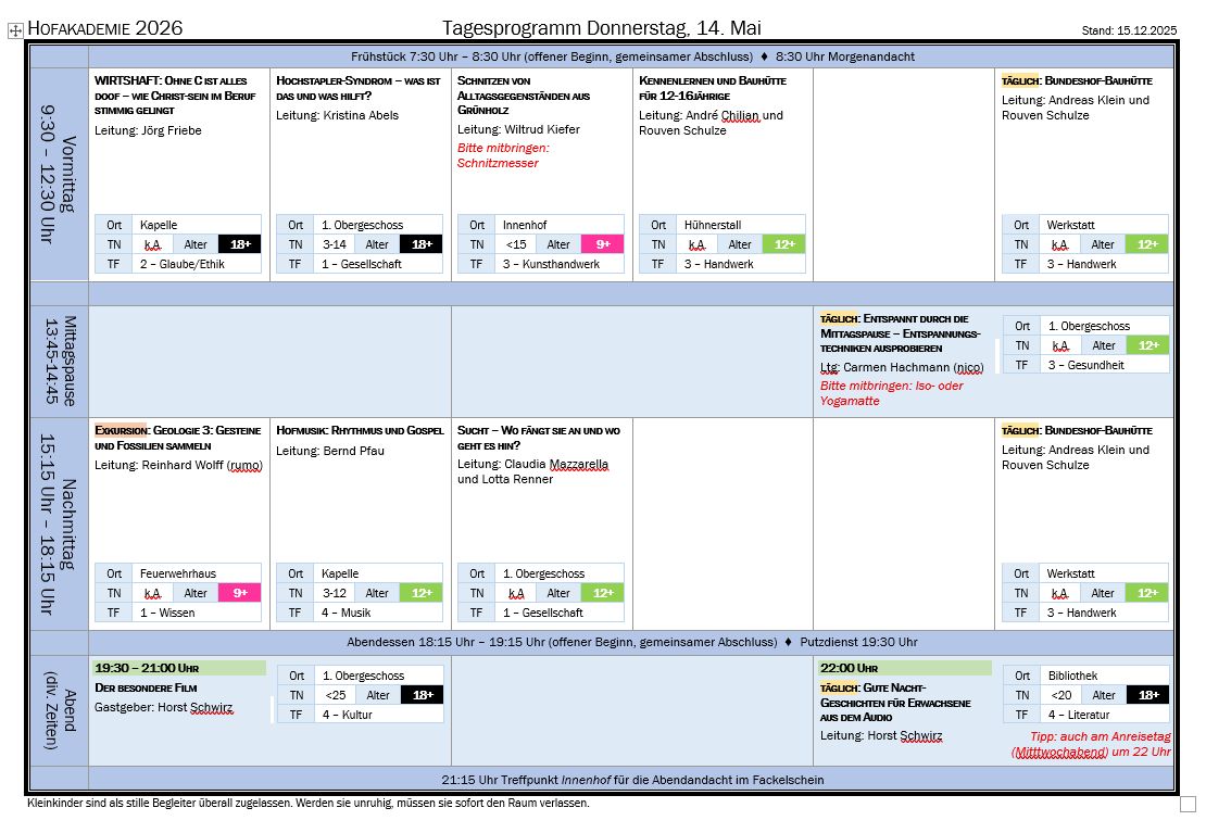 Ausführliche Seminarbeschreibungen hängen vor Ort auf der Hofakademie aus. Außerdem stellt die Seminarleitung ihr Seminar persönlich in einer Plenumsrunde vor Ort vor.
